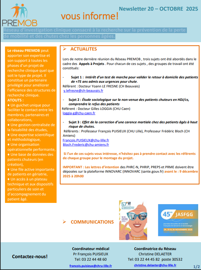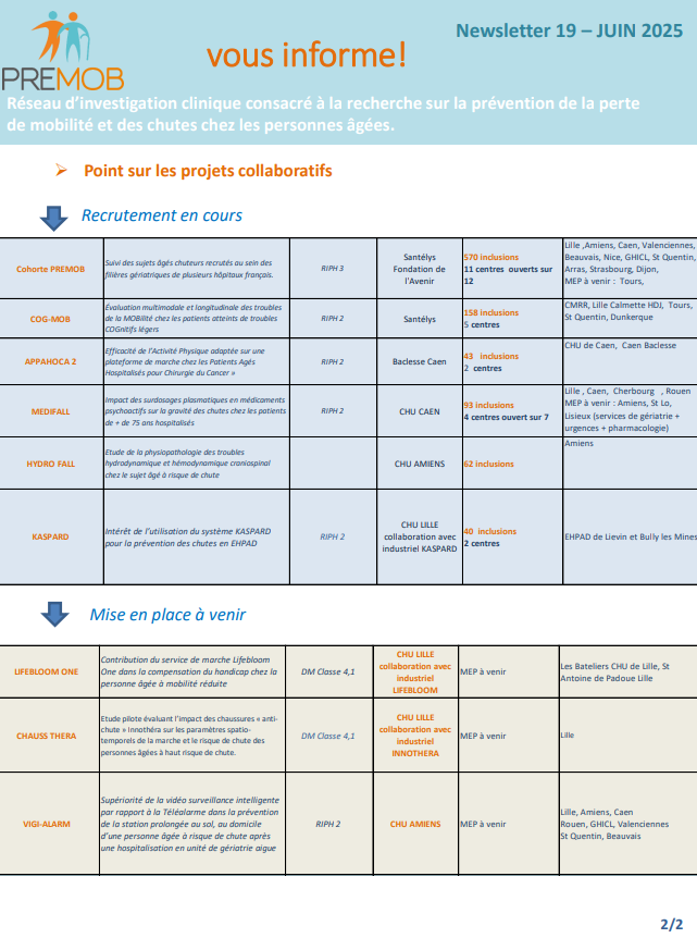 La dernière Newsletter du réseau PREMOB, réseau d’investigation clinique consacré à la recherche sur la prévention de la perte de mobilité et des chutes chez les personnes âgées est parue.