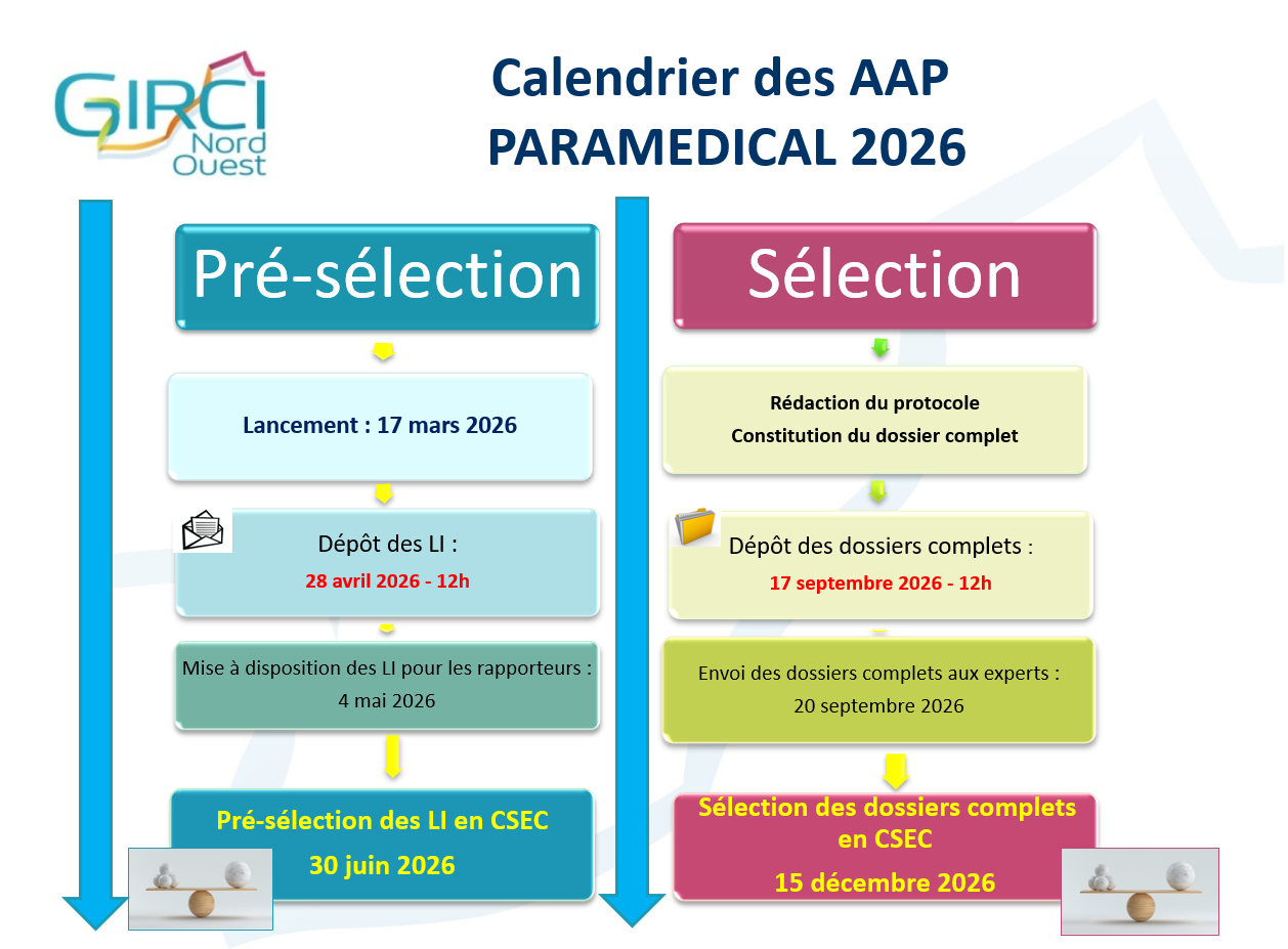 Depuis 2015, le GIRCI Nord-Ouest lance son Appel à Projets « Paramédical » destiné à soutenir et à promouvoir le développement de la recherche paramédicale au sein de l’inter région Nord-Ouest. Cet appel à projet est ouvert aux établissements de santé de l’inter région Nord-Ouest. Le financement n’a pas vocation à être pérenne, mais vise plutôt un effet levier favorisant l’émergence. Chaque projet sélectionné dans le cadre de l’Appel à Projets « Paramédical » recevra le financement de 32 000€. ObjectifsL’Appel à Projets « Paramédical » a pour but de :